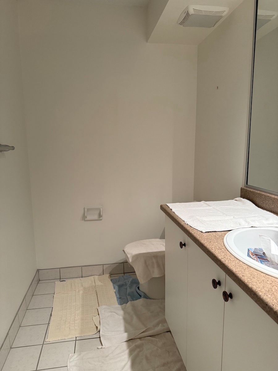 We phoned the front desk here, in the main building and, they told us the plumbing crew is on another job we’ll have to wait.